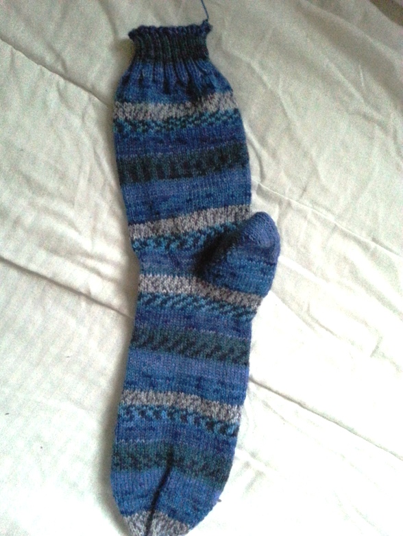 This is the heel which acts as the gusset. You work increases on either side of 2 centre stitches every other round until you have doubled the back of the leg stitches. Work the increases into any pattern you like. I choose to work the increases into a K2, P2 pattern. Example: 60 sts on sock, 30 sts for back of leg, work increases until 60 sts on back of leg, total on sock is now 90 sts.